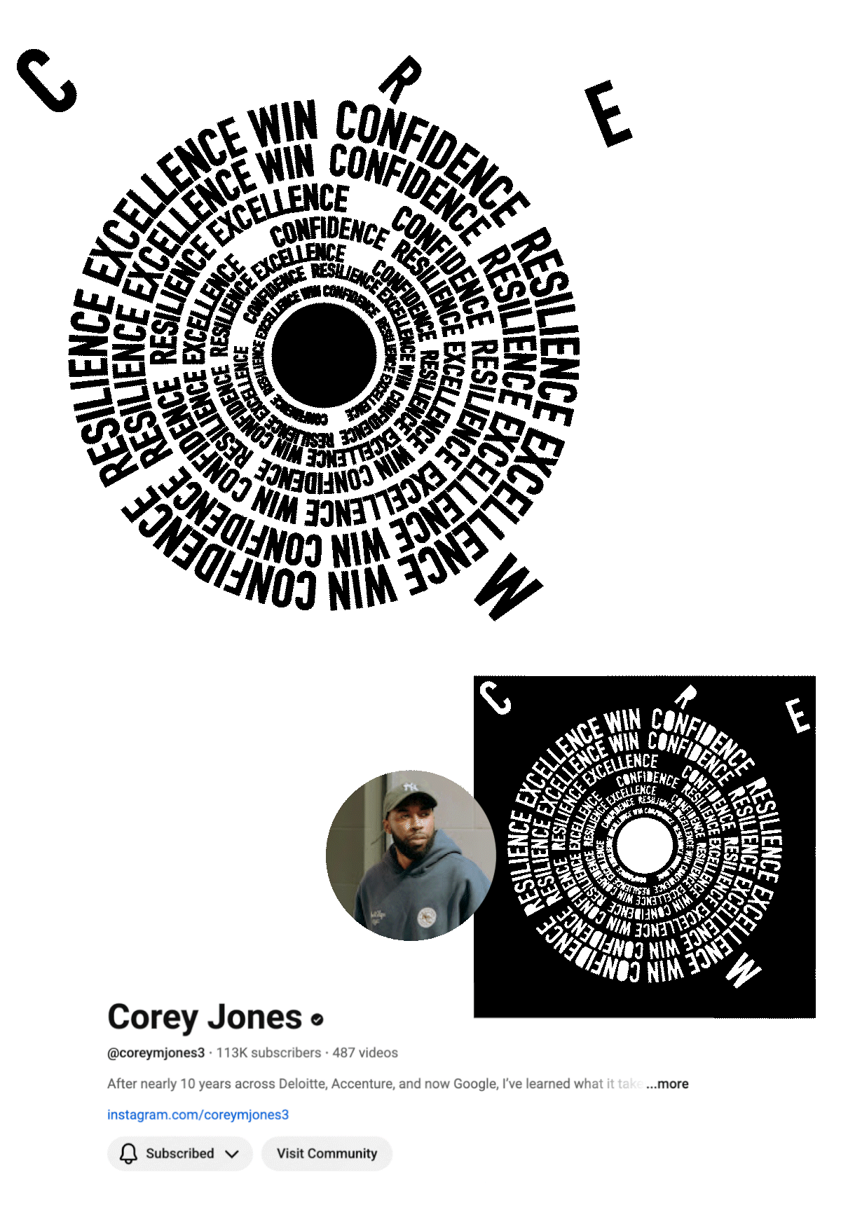 The idea for the logo came from getting to know Corey at the University of South Carolina, where we both attended. I wanted to create a logo for him that was timeless and held true no matter the season of life he may find himself in. "Confidence, Resilience, Excellence, Win" was his mantra that he used as he reached his audience from across the globe, putting him at the forefront of the YouTube platform as a positive influence.