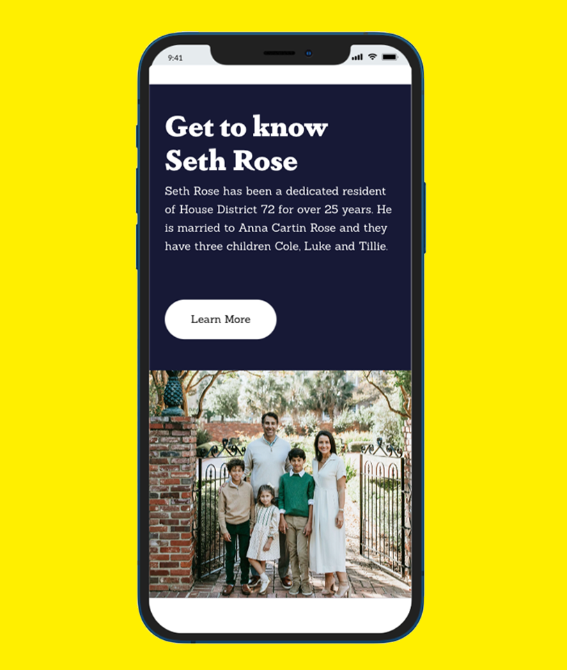 I had the pleasure of designing the 2024 campaign website for SC State Representative Seth Rose. His previous site was designed on Wix, so I was tasked with using the same format.